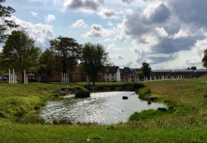 Die gesamte Anlage war eingefasst von einer Palisade, erbaut durch Harald Blauzahn in den späten 960ern, vier Meter hoch, insgesamt 1,4 km Gesamtlänge. Im Erlebniscenter haben wir Überreste der verwendeten Eichen gesehen, die Archäologen 2013 unterhalb des Teiches ausgegraben haben.