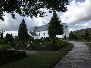 Von den beiden Grabhügeln, die die Kirche nördlich und südlich flankieren, ist der Südhügel der größte je erbaute während der dänischen Wikingerzeit (10m hoch, 70m im Durchmesser). Er wurde nie für Beerdigungszwecke genutzt. Im Nordhügel war die Grabkammer fast leer, als man sie 1820 ausgrub. Man vermutet, dass die Überreste nach der Christianisierung in der Kirche beigesetzt wurden, der Knochenfund dort legt dies nahe.