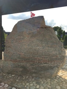 Der große Stein wurde von Gorms Sohn Harald Blauzahn als Statement seiner Macht und Ansprüche aufgestellt und von drei Seiten beschriftet. Die Inschrift lautet: „König Harald ließ dieses Denkmal zu Ehren seines Vaters Gorm und seiner Mutter Thyra. Der Harald, der ganz Dänemark und Norwegen gewann und die Dänen zu Christen machte.“ Harald übernahm das Christentum für sein Reich, und somit gilt der Stein quasi als Taufschein des Landes.