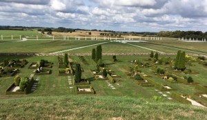 Beide Hügel werden eingerahmt durch eine riesige Grabmarkierung, einem Steinschiff, dem größten auf der Welt, 350 m lang. Laut der nordischen Mythologie konnten die Toten mit dem Schiff zu den Göttern in Valhalla Segeln. Weiße Betonsteine markieren heute die Position. Das Foto ist vom Nordhügel aus aufgenommen. Unter den Steinen dort wurden Steine des Original-Schiffes gefunden.