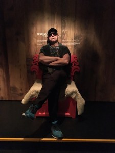Der interaktive Rundgang im Erlebniscenter verdeutlicht eindrucksvoll die Welt der Wikinger. Zuerst sitzen wir im Langhaus um das Lagerfeuer herum und lauschen alten Geschichten. Kay nimmt natürlich Haralds Platz auf dem Thron ein.