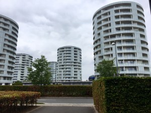 Und dann finden wir auch modere Kunst und Architektur, sie liegen sozusagen auf der Straße. Vejle verwandelt die überflüssig gewordenen Hafenareale konsequent in Neues. Über die neue Hafenfront war hier im Blog schon was zu lesen. Auf dem Foto sind die FünfSchwestern zu sehen, moderne Wohnungen in Innenstadtnähe. Die Balkonverkleidungen sind aus sandgestrahltem Glas.