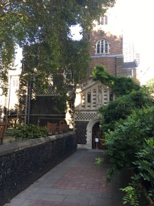 Auch die normannische Kirche St Bartholomew-the-Great, erbaut 1123, wurde von dem Feuer verschont, ebenso wie ein Wohnhaus und das Torhaus zum Kirchhof. Die hohen Mauern des benachbarten Klosters (steht nicht mehr) haben sie wahrscheinlich geschützt. Die Kirche diente schon häufiger als Filmkulisse. Da wir eine Minute nach Schließung da sind, müssen wir uns z.B. „Vier Hochzeiten und ein Todesfall“ oder „Shakespeare in Love“ zuhause angucken.