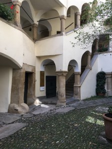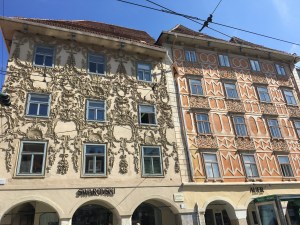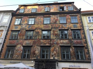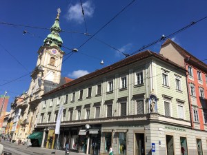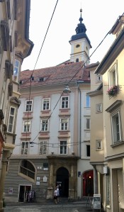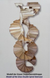 Nicht verwechseln, es gibt neben dem Schloßberg mit der nicht mehr vorhandenen Burg in der Altstadt noch eine Burg, die wird Burg genannt und ist heute der Sitz der Steirischen Landesregierung. Außerdem beherbergt sie eine Doppelwendeltreppe, korrekt: Zwillingswendeltreppe, ein Meisterwerk spätmittelalterlicher Steinmetzkunst, die bedeutendste Treppe ihrer Form in ganz Mitteleuropa. Viele Steinmetzen waren am Bau beteiligt, der dauerte nur ein Jahr, von 1499 bis 1500 und gelang sehr detailreich.
