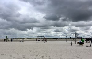 Aber noch laufen wir und laufen, vorbei an unbesetzten Strandkörben und wenig genutzten Spielgeräten, immer weiter hinaus, um zumindest mit den Füßen ins Wasser zu kommen. Der Weg ist weit, denn Hochwasser ist erst drei Stunden später. Aber es lohnt sich, das Wasser ist wirklich für Nordseeverhältnisse sehr warm. Dafür kommt der Wind sehr kühl genau von vorn und gibt uns eine ordentliche Abreibung. Im Kosmetikstudio hätten wir für das Peeling viel Geld ausgeben müssen, hier bekommen wir das jedenfalls umsonst.