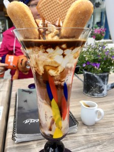 Bei ablaufendem Hochwasser geht es später zurück zum Ausgangspunkt, es wird auch kühler, da die die Sonne abschattenden Wolken immer fetter werden. Was kann man sonst machen außer nutzlose Souvenirs einzukaufen oder später zu bereuende Spontankäufe zu tätigen? Gummibärchen probieren (klappt), Spiele ausprobieren im Spielzeuggeschäft (klappt nicht, Mittwochs ist in NF schließlich Ruhetag, wo kommen wir denn da hin?!), Fischbrötchen essen (klappt immer, muss aber nicht immer unbedingt beim allgegenwärtigen Gosch sein). Das Glück wird gekrönt von einem riesigen Eisbecher, gern mit Alkohol (damit klappt ja auch vieles besser) beim Italiener, bevor es wieder Richtung Zuhause geht. Dort gibt es dann auch wieder digitale Daten zu empfangen.