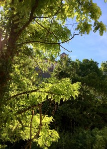 Diese erste große Goethe-Ausstellung seit 25 Jahren ist groß angelegt, zu groß für uns (wir hatten uns schon ausführlich mit Michael Jackson auseinandergesetzt, der uns zeitlich doch näher steht). Einige Bilder, z.B. von Caspar David Friedrich, William Turner, Piet Mondrian, Paul Klee und Johannes Itten, Cy Twombly und Andy Warhol schauen wir uns ausführlicher an, auch einige Filmausschnitte aus „Die Leiden des jungen Werther“ (wobei die Defa-Version aus den 1970ern inzwischen furchtbar altertümlich wirkt) und die Plakate der vielfältigen Faust-Aufführungen. Es hätte noch so viel mehr zu sehen gegeben, aber die Luft war sozusagen raus. Auf dem Dach des Museums waren in der Ausstellung „Goethes Gärten“ die zentralen Motive aus seinen beiden Gärten in Weimar zu sehen. Ganz hübsch, gute Luft, aber für uns, die wir die englischen Gärten und Parks lieben, ziemlich nichtssagend.