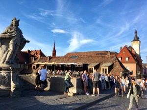 Alte Mainbrücke, errichtet 1473-1543; die charakteristischen Heiligenstatuen hinzugefügt um 1730; Touristen aller Art von heuteJetzt weiß ich auch den Unterschied zwischen untergärigem und obergäriges Bier!