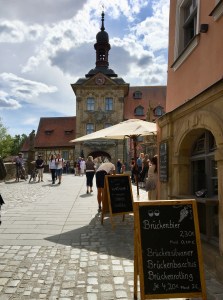 Entsprechend viel alte Bausubstanz ist zu besichtigen, was auch entsprechend viele Touristen gerne tun. Die Nähe zu Bayreuth (Wenn dort die Wagner-Festspiele stattfinden und Wetter und/oder Inszenierung/ Sänger*innen nicht so gut sind, dann merken es die Bamberger Kaufleute sofort in ihren Kassen.) trägt das Übrige bei. Nach Rotenburg ob der Tauber (nur anderthalb Stunden mit dem Auto entfernt) müssen die Touristen nicht unbedingt, denn in Bamberg gibt es sogar eine Dependence von Käthe Wohlfahrts Weihnachtsfachgeschäft. Zum Musikhaus Thomann (nur 15 Autominuten entfernt) müssen wir nicht, da dort übers Internet eingekauft wird, wenn’s benötigt wird.