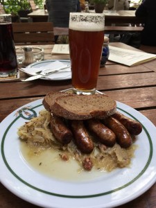 Hansla („kleiner Hans“) mit niedrigem Alkoholgehalt, dazu Bratwürstchen mit Dämpfkraut und Rauchbierbrot.Kay freut sich über eine anständige Brotzeit, mit Johannisbeerschorle, damit die Farbe im Glas zumindest gleich ist.