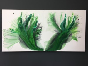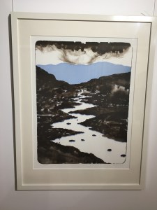 Hier hängen auch weitere Werke von Jóna Rasmussen. Besonders beeindruckt waren wir von den Arbeiten von Marius Olsen (*1963), in denen ebenfalls die herbe Landschaft der Inseln eine Hauptrolle spielt.