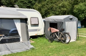 Nebenan wird gesaugt, anhaltend und ausdauernd (großer Wohnwagen, allerdings mit einem ungewöhnlich kleinen Vorzelt). Dann kommen auch mal die Teppiche zum Lüften raus. So einen kleinen Zelt-Schuppen wie rechts im Bild haben sie auch fast alle, allerdings immer in neuerer Variante als dieses.