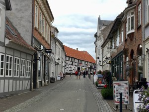 Auf dem Campingplatz erzählte einer unserer Nachbar von Bogense im Norden der Insel. Dort sollte es sehr schön sein. In der Nähe steht ein Renaissance-Schloss, Harridslevgaard Slot, das wir uns auch ansehen wollten, wenn wir schon mal da in der Gegend sind. Es hat den größten Rittersaal Dänemarks, der in Privatbesitz ist. Aber zunächst nach Bogense. Das Auto zu parken ist in Dänemarks Kleinstädten immer einfach und im Zentrum möglich. Durch einen kleinen Bogengang erreichten wir eine zentrale Einkaufsstraße, die uns Richtung Hafen führte. Auf dem Weg dorthin trafen wir diesen netten kleinen Fahrradfahrer: