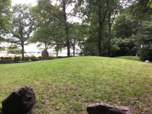 Stattdessen fuhren wir noch etwas an der Küste weiter, am Gyldensteen Strand vorbei, dem größten Renaturierungsprojekt auf Fünen. Hier wurde der 1872 gebaute Deich (um die landwirtschaftlich zu nutzenden Flächen zu vergrößern) 2014 wieder entfernt. Seitdem belebt sich die Vogelwelt sichtbar. Wir bogen jedoch landeinwärts ab und wurden vom Navi quer durch die Getreidefelder, auf denen die Ernte in vollem Gang war, geleitet. Unser Ziel war Glavendruplunden. In diesem Hain stehen Gedenksteine aus der Bronze-, der Wikinger- und der Neuzeit (Grundgesetz, Wiedervereinigung, Befreiung 1945). Die berühmtesten Anlagen sind jedoch die aus der Wikingerzeit: die Schiffssetzung und der große Runenstein.