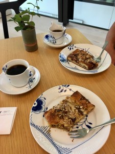 Hier werden uns Kaffee und hervorragender Kringel auf musselmalet Porzellan von Royal Copenhagen serviert: