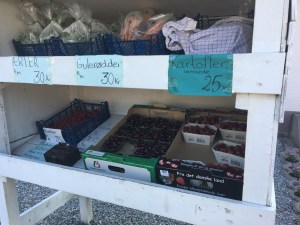 Wir sind wieder ein Stückchen weiter gefahren, diesmal nach Südosten und sind vor ein paar Tagen auf dem Falsled Strand Campingplatz gelandet. Hier stehen wir unter hohen Eichen zusammen mit vielen internationalen Gästen und sehr vielen Familien mit Kindern jedes Alters (ein paar Dauercamper gibt‘s auch hier), und es gefällt uns ausnehmend gut. Wir erholen uns durch recht konsequentes Abhängen im Wohnwagen, im oder vor dem Zelt, je nach Wetterlage. Nur zum Einkaufen fahren wir mal eben nach Faaborg. Die wirklich wichtigen Lebensmittel im Sommer gibt es aber auch hier in den Buden am Straßenrand.
