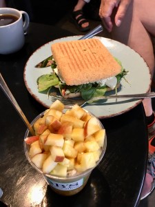 vierköpfige Familie mit SchirmWir wärmen uns schließlich in einem Café mit warmer Grütze und Panini auf.