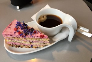 Auch das Café ist in einem der Turmzimmer untergebracht. Es gibt ein Kombiangebot aus Museumseintritt plus Kaffee und Kuchen, was wir gern in Anspruch genommen haben. Die Dame an der Kasse plante mit uns genau den Cafébesuch: vor oder nach dem Gang durch die Ausstellung; Kaffee oder Tee; Beerentorte oder Nougateisbömbchen (die heutige Auswahl). Wenn nicht viel los ist im Museum ist sie es nämlich auch, die alles vorbereitet und serviert (EinFrauBetrieb).