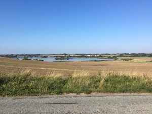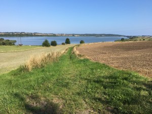 Nun, am Ende des Sommers, war es endlich soweit. Es konnte losgehen. Es gibt zwei Wander- bzw. Fahrradrouten, die, wenn man sie verknüpft, eine Rundtour von ca. 9 km ergeben (plus der An- und Abfahrt vom Platz). Kurz nachdem wir den Campingplatz verlassen hatten, wies ein Hinweisschild uns auf den Fahrradweg hin. Wir fuhren auf einem kleinen Deich durch das Sommerhausgebiet von Diernæs und erreichten schließlich die Teerstraße, die uns nach einer kurzen bergauf-Fahrt nach rechts abbiegend zu einem der Info-Punkte am See führte.