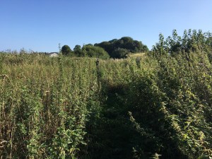 So bequem ging der Weg leider nicht weiter. Nachdem uns zwischen Feldrand und Hecke Brennnesseln und Brombeeren den Platz streitig machten, ging es anschließend durch mannshohen Schilf. Gefahren waren wir da schon länger nicht, auch das Schieben des Rades wurde schwieriger.