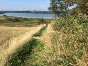 Wie auf der Karte (s.o.) zu sehen ist, führte der Pfad (wenn man ihn denn so nennen kann) um einen Bauernhof herum. Einfacher wäre natürlich der Weg über deren Grund und Boden gewesen, der war aber durch eine Kette abgesperrt. Der nächste Abschnitt sollte anders schweißtreibend werden, es ging am Feldrand entlang, wir konnten etwas fahren. Dann aber führte der Weg ziemlich steil hügelaufwärts, die Räder mussten erneut mehr getragen als geschoben werden.