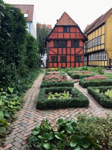 Hinter dem Haus befindet sich heute ein kleiner öffentlicher Bürgergarten. So konnten wir auch die Kanonenkugel im Giebel entdecken (vierte Gefachreihe, zwischen den beiden Fenstern). Die stammt aus dem Kampf um Kolding im April 1849 und wurde dort eingemauert.