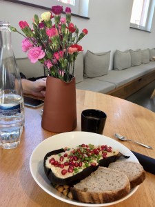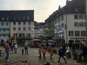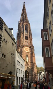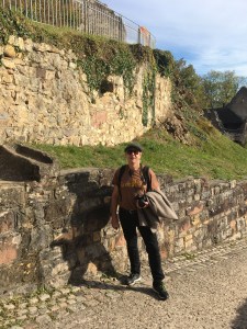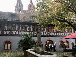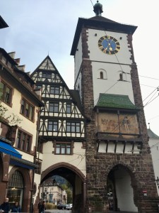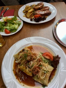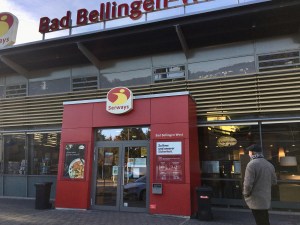 Wir fuhren nach Weil am Rhein und stiegen um in die Bahn nach Lörrach. Beide Städte liegen sehr nah beieinander, getrennt durch den Tüllinger Berg (daher die Fahrt durch den Tunnel) und dem Fluss Wiese. Oberhalb von Lörrach liegt die Burg Rötteln, dahin sollte unser Ausflug gehen. Vom Bahnhof aus konnten wir die Fußgängerzone schon sehen, irgendwo dort würde es wohl auch die Touristinformation geben. Sie war sogar gut ausgeschildert, doch die Nebensaison machte auch vor ihr nicht Halt: Mittagspause von 13-14 Uhr! Das ist uns bisher auf keiner Reise passiert. Egal, gute Gelegenheit, selbst eine Mittagspause einzulegen. Wir fanden einen guten italienischen Imbiss am Marktplatz mit leckerer Tagespasta.