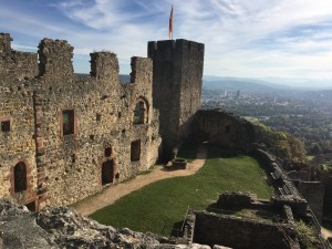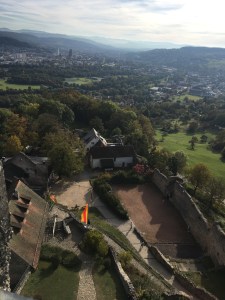 Danach erklommen wir den Bergfried, der sich an der höchstgelegenen Stelle der Anlage erhebt. Er diente ebenfalls als Wachturm und Gefängnis, außerdem als Rückzugsort im Verteidigungsfall. Und von dort schauten wir bis ins Schweizer Juragebirge!!