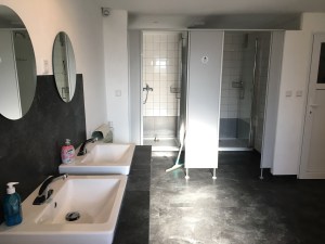 Insgesamt strahlt der Platz etwas sehr abgerocktes aus. Man fährt auf ein aufgegebenes Bauerngehöft zu, so der erste Eindruck. Nur der Schlagbaum kennzeichnet den Campingplatz, der wohl auf der ehemaligen Hauskoppel eingerichtet wurde. Die Betreiber haben ihn erst vor zwei Jahren übernommen und werkeln nach Feierabend nach ihrem normalen Job so vor sich hin. Im Moment wird das Sanitärgebäude (hellgelb) von außen gedämmt. Innen sind sie fertig und man bekommt einen Eindruck davon, wie es insgesamt werden könnte. Aber so lange wollen wir hier nicht bleiben.