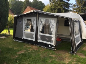 Heute Vormittag ging es zum Händler nach Bad Salzuflen, um unser neues Vorzelt zu holen. Wir haben es bei eBay-Kleinanzeigen gefunden, ein Ausstellungsstück mit ein paar kleinen Macken zum Selbstabbau. Dafür gibt es das gute Stück 30,76% günstiger, und: es ist ein Vorzelt von Isabella! Die größere Macke, ein Loch in einer der „Fensterscheiben“, wurde schon im Vorwege zur Reparatur nach Dänemark geschickt. Ob das Paket rechtzeitig wieder da sein würde, war aber nicht sicher. Der zweite Mängel ist mit dem Allzweck-Panzer-Klebeband gut und fast unsichtbar selbst zu beheben.