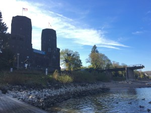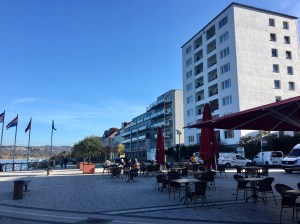 Und genau hier ist es, im Gegensatz zu weiten Teilen des Landes, gar nicht grau und neblig. Das Auto stellen wir zentral hinter dem Hafen ab, der Weg in die Innenstadt führt über eine Holzbrücke über das Hafenbecken.