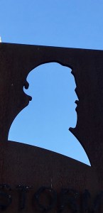 Theodor Storm, hier als blauer Scherenschnitt vor dem Stormhaus, setzte Husum mit seinem berühmten Gedicht „Die Stadt“ von 1851 ein literarisches Denkmal: