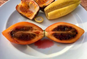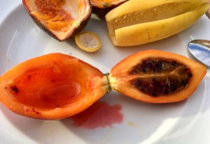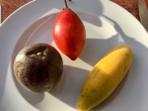 Passionsfrüchte, zumindest die violett-farbene Sorte (links im Bild, nicht zu verwechseln mit den gelben, doppelt so großen Maracuja, die zur selben Gattung gehören) kann man auch bei uns kaufen. Eine Variante aus der großen Familie der Passionsfrüchte ist die banana passionfruit (rechts im Bild), die nur in Südamerika wächst, eigentlich. Und dann liegt in der Mitte noch eine rote Variante auf dem Teller, die sie im Restaurant als English tomato bezeichnen. Es ist aber auch eine Passionsfrucht.