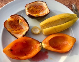 Auf jeden Fall ist die Passionsfrucht sehr gesund. Sie enthält die beiden B-Vitamine B6 und B3, Vitamin C, Beta-Carotin, Vitamin E, Eisen und Kalium, außerdem auch noch Magnesium und Phosphor. Dazu ist sie kalorienarm, sie wird also zumindest während unseres Aufenthalts hier täglich auf dem Speiseplan stehen.