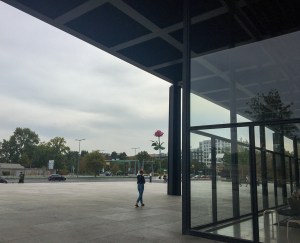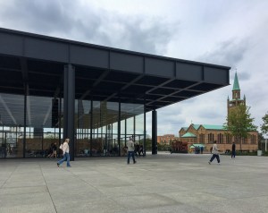 Dann geht es wieder nach oben in den Teil des Gebäudes, in den wir eigentlich wollten. Diese Ikone der Klassischen Moderne von Ludwig Mies van der Rohe schloss 2015 wegen Renovierungsarbeiten. Nach sechs Jahren öffneten sich die Türe wieder. Nun kann man wunderbar durch die Fenster hinein und herausschauen, so wie zur Eröffnung 1968. Es ist toll, lichtdurchflutet, immer noch sehr modern wirkend, ein schönes Gebäude. Wir finden, die 140 Millionen Euro sind gut angelegt worden.