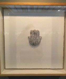 Für „Fatima“ gestaltete sie fünf ähnlich große Hände aus Stahl (Nadeln und Nadelstiche), Blut, Horn (Fingernägel) und Haar, rahmte sie in fünf identische Kästen und beleuchtet sie mit Lampen, die Überwachungskameras ähneln.