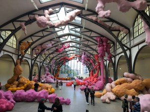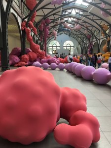 Die Empfangshalle wird zurzeit von den biomorphen Skulpturen der Spanierin Eva Fabèrgas „bevölkert“. Sie winden sich nicht nur wie Reisende in einer Bahnhofshalle über den Boden, sondern erobern auch die gusseisernen Träger des Gebäudes. Auf den ersten Blick scheinen die „Devouring Lovers“ nur stoffliche Objekte zu sein, doch bei genauerem Beobachten beginnen die „verschlingenden Liebenden“ sich leicht zu bewegen, zu vibrieren, um dann unvermittelt wieder still zu sein. Die insgesamt siebzig Skulpturen wurden speziell für diese Halle angefertigt. In der Ausstellung haben die Kinder großen Spaß am Nachbauen der Skulpturen aus Luftballons und Nylonstrumpfhosen.
