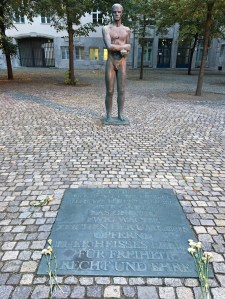 Das Bronzedenkmal eines jungen Mannes mit gefesselten Händen stand vor der Umgestaltung 1980 noch auf einem Sockel. Geschaffen wurde es 1952 vom Bildhauer Richard Scheibe, wie auch immer dieser damals zu diesem Auftrag gekommen ist.