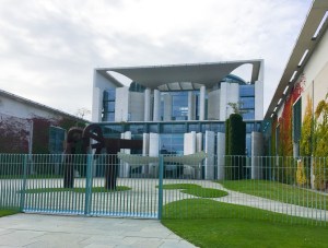 Wir überqueren die Spree, die hier einen Bogen macht, über die Moltkebrücke, von der aus wir das Bundeskanzleramt sehen können. Etwas später ist dieses auch von vorne zu sehen. Über die dafür gewählte Architektur kann man immer noch vortrefflich streiten.