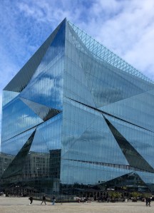Unser Weg zurück vom Museum führt uns durch den Berliner Hauptbahnhof hindurch zum Washingtonplatz, wo gegenüber des Bahnhofs das CubeBerlin steht, ein zehnstöckiges Bürogebäude. In der mehrfach nach innen gefalteten Fassade spiegelt sich die Umgebung wie in einem Kaleidoskop.