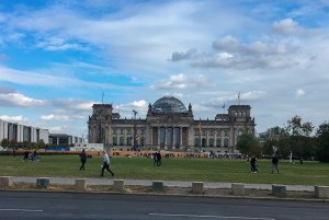 Etwas weiter die Straße entlang sehen wir links das Reichstagsgebäude, der Sitz des Bundestages. Heute ziert eine begehbare Glaskuppel des Architekten Norman Foster das Gebäude.