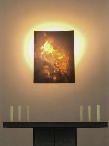 Die Künstler werden stets eingeladen, auch ein Altarbild für die Zeit der Ausstellung anzufertigen. Das Bild von Mattner suggeriert einen Blick in das Universum. Er verwendete unter anderem sedimentierten Kupferstaub für das Bild.