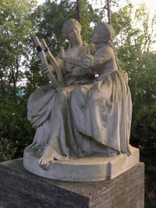 Ganz frisch gereinigt und vergoldet erstrahlt das Denkmal für die drei Komponisten Beethoven, Mozart und Haydn (auf der nicht sichtbaren Seite). Wir wollten es zuerst gar nicht angucken, da wir dafür die mehrspurige B96 hätten überqueren müssen. Doch inzwischen verläuft diese unterirdisch im sogenannten Tiergartentunnel, wir können einfach nur über den Rasen laufen zum „Musikerofen“ (die Berliner haben ein Faible für Spitznamen).