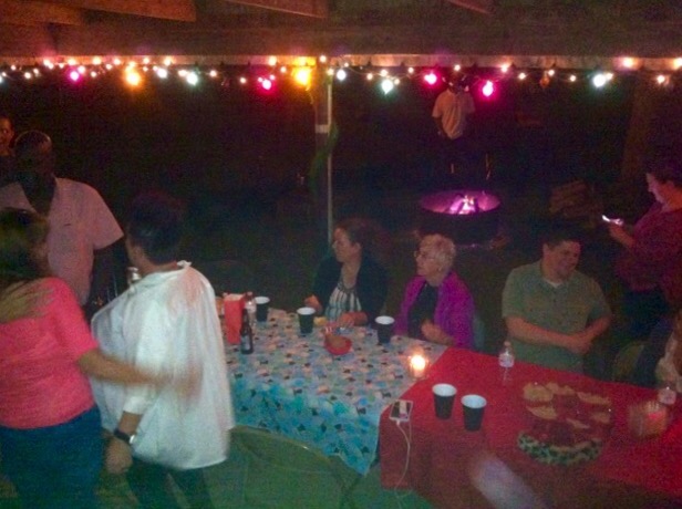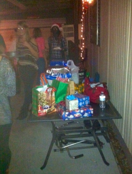 In Lafayette und Umgebung gibt es etliche Deutsche aus allen Teilen der Bundesrepublik. Ein Teil, alles Frauen, hat sich zum German Club zusammen geschlossen. Sie treffen sich einmal im Monat, meistens in Restaurants, und eben zur Weihnachtszeit bei einer von ihnen zuhause. Jeder brachte etwas zu essen für das Büffet mit, ein Weihnachtsgeschenk, die eigenen Getränke und evt. Kinder und den Mann, der Amerikaner ist. Es gab so leckeres Essen, unglaublich gut gewürzt, unter anderem Chili aus Reh-Hackfleisch (They cooked Bambi!), Rehbraten und Truthahn, gefüllte Paprika, Salate, Erdbeeren mit Schokolade überzogen, sandwiches und noch viel mehr. Da das Wetter gut war (25 Grad am Abend), stand das Essen drinnen und die Feier war draußen. Auf ein Cajun-Chili, egal ob aus Reh oder anderem Fleisch, gehört geriebener Cheddar und dazu isst man Chips bzw. Nachos. Ein ordentlich großes Lagerfeuer durfte nicht fehlen, da standen eher die Männer drum herum. Wir hatten statt Essen die Gitarre und Weihnachtslieder mitgebracht und nach dem Essen wurden deutsche Weihnachtslieder geschmettert. Kay sang immer alle Strophen, der „Chor“ war, wie eigentlich immer bei solchen Anlässen, besonders bei der jeweils ersten Strophe sehr aktiv dabei. Dann kamen die Geschenke, die vorher unter dem Weihnachtsbaum lagen, auf den Tisch (innen war es einfach zu warm). Das Spiel heißt Bad Santa. Jeder, der ein Geschenk mitgebracht hatte, durfte eine Nummer aus der Wichtelmütze ziehen. In dieser Reihenfolge wurde dann nacheinander ein Geschenk aus dem Stapel ausgesucht, ausgepackt und herumgezeigt. Das hieß aber nicht, dass man es ohne weiteres behalten konnte. Die nachfolgenden Personen durften es, statt ein Geschenk auszuwählen, auch stehlen. Insgesamt durfte ein Geschenk bis zu dreimal gestohlen werden, bis es dem letzten schließlich gehörte. Das gab ein großes Hallo unter den Frauen, favorisierte Dinge wie ein Gewürzregal, eine große Wanduhr oder ein Bademantel und viel Spaß für uns beim Zuschauen.