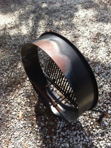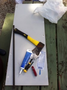 nur Präzisionswerkzeug (die Bohrlöcher sind schon weiß) …… und der Amboss Holzspachtelmasse in die ausgerissenen Bohrlöcher und mit einem der Winkel glatt gezogen, warten, bis es aushärtet. Damit man auch sehen kann, dass dabei etwas passiert, ist die Masse beim Auftragen quietschrosa. Mit der Zeit wird sie dann weiß. Die Winkel, die wir gekauft hatten, waren zu groß. Also die alten verbogenen auf dem Eisenring der Feuerstelle mit dem Beil wieder gerade gebogen. Mit dem Lineal an unserem Vergrößerungslesezeichen wurden die Abstände für die Bohrlöcher neu eingezeichnet. Wie schon gesagt, ohne Präzisionswerkzeug läuft hier gar nichts.