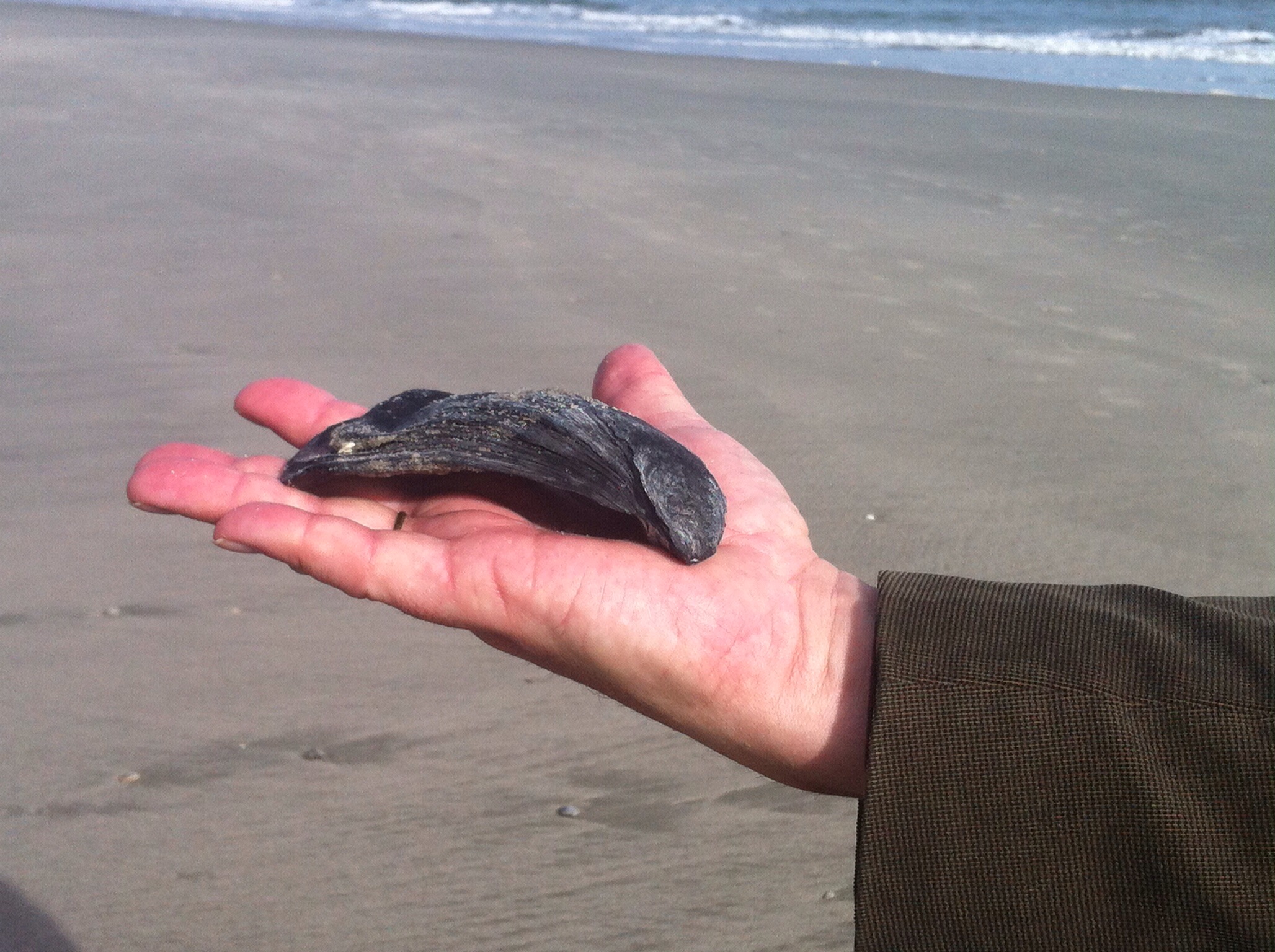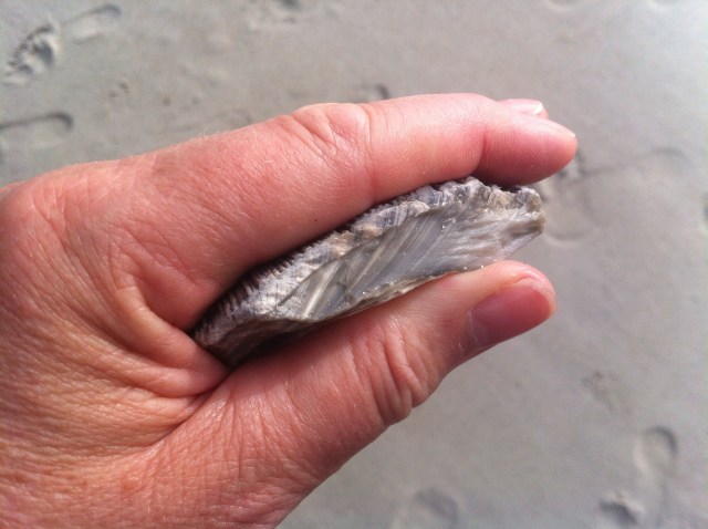 Bisher haben wir am Strand Muscheln gefunden, meistens Bruchstücke, von denen die schönsten und glänzendsten in einer Schachtel zurück zum Campground transportiert werden. Heute allerdings waren wir bei Niedrigwasser und mit den Füßen im 17 Grad warmen Wasser unterwegs. Das sorgte für fette Beute! Alles, was das Sammlerherz hier an den Stränden finden kann, haben wir auch gefunden: schwarze, fossilierte Haifischzähne (viel größer als die, die wir in Myrtle Brach schon gefunden haben), einen strand dollar (den ersten, natürlich keinen lebenden mehr) und den Traum schlechthin, und das gleich drei mal, riesige vollständige Muschelschalen.