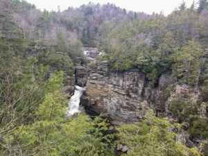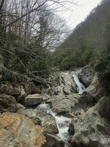 Doch wir halten quasi gleich wieder an, bei milepost 83 befinden sich die Fallingwater Cascades. Wir wandern zum Bach, überqueren ihn auf einer Brücke und folgen den Verlauf in die Schlucht hinunter. An den Resten einer Brücke geht es über Felsbrocken wieder auf die andere Seite und durch den Wald hoch. Insgesamt sind es nur gute zwei Kilometer, aber dafür mit einem anständigen Höhenunterschied.