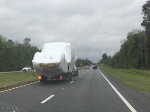 Schon auf der Autobahn wurden wir von einem Schwerlasttransport mit Überbreite überholt. Eine ziemliche große Yacht auf dem Weg nach Florida. Der Transporter musste auf der Autobahn eine agricultural inspection (nicht dass merkwürdige Pflanzen oder Tiere eingeschleppt werden) und die Waagen passieren (Wieviele Tonnen so ein Gespann wohl wiegt?). Und dann überholt er uns tatsächlich noch einmal auf dem Highway und ich kann das Foto machen.