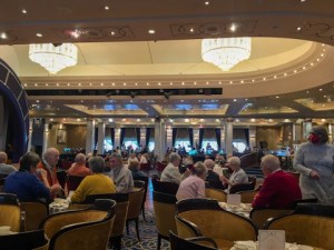 Hat es uns nun gefallen? Schwer zu sagen. Das Essen an Bord war überragend gut. Bei allen anderen Dingen müssen wir Abstriche machen. Die Mehrheit der Passagiere sieht das wahrscheinlich anders, also liegt das Problem wohl eher bei uns. Auf der Wikipedia-Seite der QM2 steht „Die Queen Mary 2 ist das Flaggschiff der Cunard-Flotte und erinnert sowohl in ihrem Erscheinungsbild als auch durch die Gepflogenheiten an Bord an die Transatlantikliner des frühen 20. Jahrhunderts.“