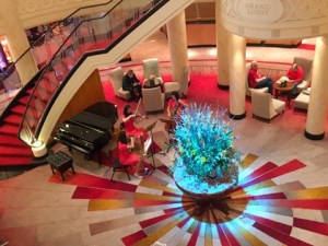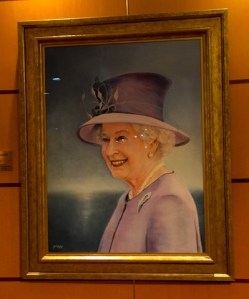 In allen Treppenhäusern und Gängen wird auf großen Tafeln die Geschichte der Cunard Line und ihrer großartigen Schiffe und deren großartigen Kapitäne und ihren illustren Gästen dargestellt. Die dargestellte Geschichte endet in den fünfziger Jahren des vergangenen Jahrhunderts. Wie es die Tradition auch gebietet, hängen überall Porträts der königlichen Familie. Ebenso werden Trophäen und Memorabilia ausgestellt. Wir leben inzwischen im 21. Jahrhundert, davon würde man auf dem Schiff nichts bemerken (es sei denn, man kauft das Internet-Paket, das nicht zuverlässig funktioniert).